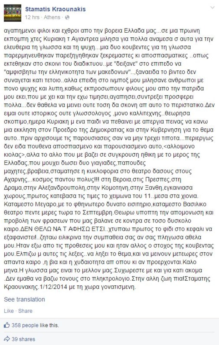 «Αγαπημένοι φίλοι και εχθροί απο την Βόρεια Ελλάδα μας...σε μια πρωινή εκπομπή χτες Κυριακή τ' Αγιαντρήα μίλησα για πολλά ανάμεσα σ' αυτά για την ελευθερία, τη γλώσσα και τη ψυχή... μια-δυό κουβέντες για τη γλώσσα παρερμηνεύθηκαν, παρεξηγήθηκαν ξεκρέμαστες κι αποσπασματικές ... όπως εκτέθηκαν στο σκοινί του Διαδικτύου... Με "δείξανε" στο επίπεδο να "αμφισβητώ την ελληνικότητα των Μακεδόνων".., ξαναείδα το βίντεο και δεν συνάγεται κατι τέτοιο... αλλά επειδή στο ίνμποξ μου μιλήσανε άνθρωποι με πόνο ψυχής και λύπη, καθώς εκπροσωπούν φίλους μου απο την πατρίδα μου εκεί, που με 'χει και την έχω τιμήσει, αγαπήσει, συντρέξει, προσφέρει πολλά... Δεν θα' θελα να μείνει ούτε τόση δα σκόνη απ' αυτό το περιστατικό. Δεν είμαι ούτε ιστορικός, ούτε γλωσσολόγος, μόνο καλλιτέχνης... Θεώρησα σκόπιμο, ημέρα Κυριακή, μ' ένα παιδί να πεθαίνει με απεργία πείνας να κάνω μια έκκληση στον Πρόεδρο της Δημοκρατίας και στην Κυβέρνηση για το θέμα αυτό... Πριν αρχίσουμε τις παρουσιάσεις σαν να μην τρέχει τίποτα.... Περιέργως δεν είδα πουθενά αποσπασμένο και παρουσιασμένο αυτό <αλλοίμονο κιολας>, αλλά το άλλο που με βάζει σε σύγκρουση ηθική με το μέρος της Ελλάδας που μου' χει δώσει δυο γιαγιάδες, παπούδες μαχητές, βραβεία, σταμάτησε η κυκλοφορία στο θέατρο Δάσους στους Αχαρνής,.. Κόσμος παντού πολύς!!! στη Βέροια, στις Πρέσπες, στη Δράμα, στην Αλεξανδρούπολη, στην Κομοτηνή, στην Ξάνθη, εγκαινίασα χώρους, πρώτος κατέβασα τις τιμές το χειμώνα του '11 μέσα στα χιόνια. Κατάμεστο Μέγαρο, με το φθηνότερο δυνατό εισιτήριο, κατάμεστο Βασιλικό θέατρο πέντε μέρες τώρα το Σεπτέμβρη. Καλό μήνα. Η γλώσσα μας ειναι το μέλλον μας...Σταμάτης Κραουνάκης.1/12/2014 με τη χώρα γονατισμένη».