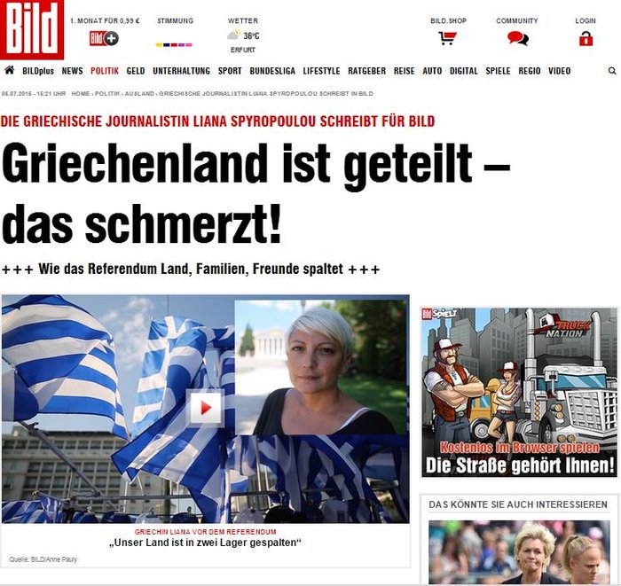 Η ελληνίδα δημοσιογράφος Λιάνα Σπυροπούλου κάνει ρεπορτάζ για τη Bild. Η προσωπική μαρτυρία της αναρτήθηκε σήμερα στη διαδικτυακή έκδοση. Η Bild «μιλά» ελληνικά.