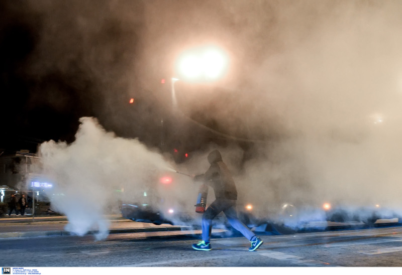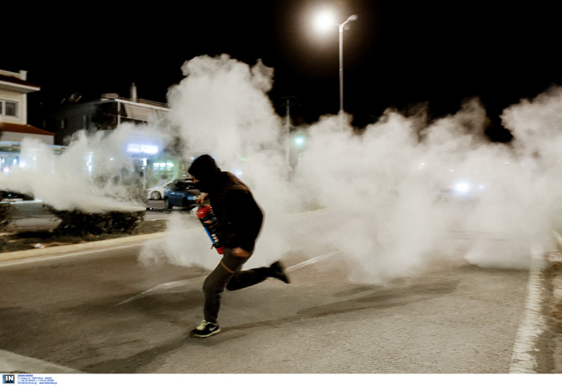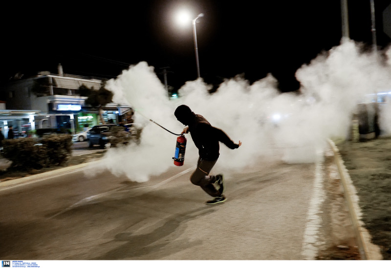 Ομάδες νεαρών έριξαν πέτρες στα περιπολικά, που είχαν αποκλείσει την περιοχή προκειμένου να μπλοκάρουν τις κόντρες ενώ κάποιοι από αυτούς, όπως φαίνεται και στις φωτογραφίες, «ξέκασαν» και με πυροσβεστήρα τους αστυνομιικούς.